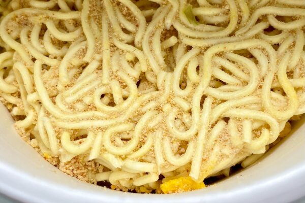 麺は油で揚げたフライ麺で、湯戻し時間は標準の3分。調理前の見た目は「濃厚味噌ラーメン」と別物で、こちらも開封直後から八海山の酒粕に由来する香りが漂ってくるのですが、同時に麺から滲み出る揚げ油のニオイも強く、比較的にチープな印象が否めません。