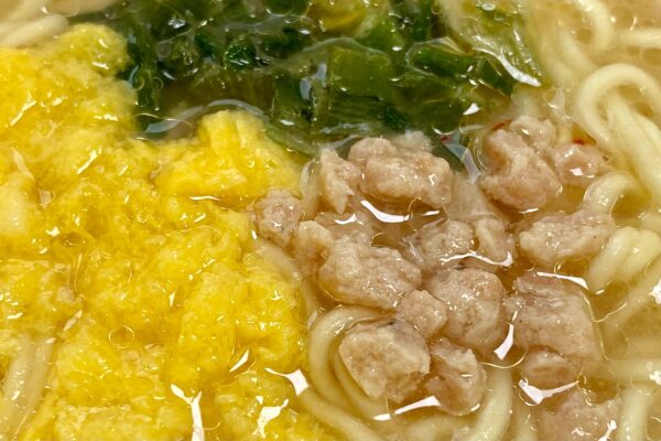 ネギは熱風乾燥(AD)なので、安っぽい風味やジャキジャキとした食感が気になるタイプになりますが、ふわふわのタマゴは口当たり・風味ともに好印象。いっそのことネギを抜いて鶏肉そぼろの量も減らし、タマゴをメインに据えたほうが綺麗にまとまったような気がしないでもないけれど、妥当といえば妥当な取り合わせでしょうか。それから赤唐辛子のアクセント、ほんのちょっとくる刺激と芳ばしさがスープに合っていました。