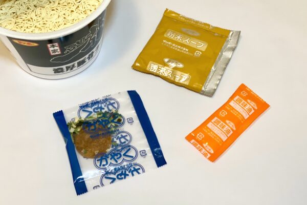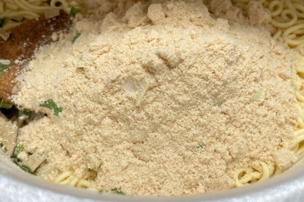 別添の小袋は「かやく」と「粉末スープ」も先入れなのですが、ここで作り方のポイント。前述のようにサンポー食品の粉末スープは他社の基準を大幅に上回る量なので、それを確実に溶かすために「かやく」をあけてから「粉末スープ」を入れるよう留意してください。同社のカップラーメンは、ほぼ例外なく同じ手順を推奨しています。