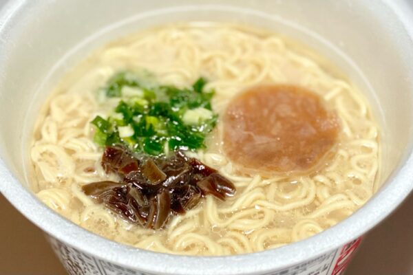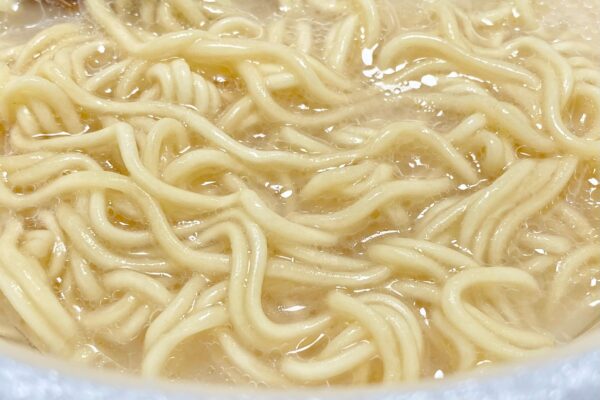 しかし、食べ始めのコリコリとした歯応えが心地好く、揚げ油に由来するラードの芳ばしさや適度な縮れも含め、後述するスープとの相性は悪くないどころか違和感なくフィット。調理前の麺重量は85gなので「スーパーカップ1.5倍」(エースコック)や「でかまる」(東洋水産)をはじめとする大盛りバケツ型の基準値(めん90g)よりも控えめではあるものの、量に関して体感的な不満を覚えることはないでしょう。