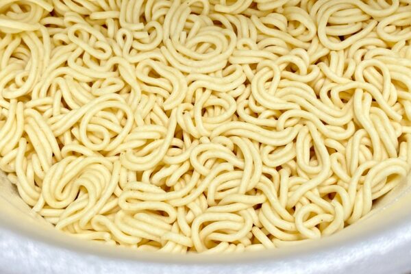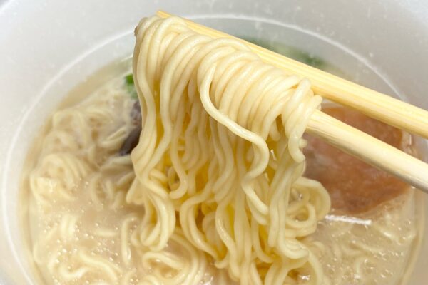 今回のカップラーメンに使われているのは、切刃22番(溝巾 約1.4mm)の油揚げ麺なので、湯戻し時間と切刃番手は標準どんぶり型の「焼豚ラーメン 九州とんこつ味」と同じです。ただ、大盛り用の油揚げ麺は時間の経過に伴う質感の変化に対応するために、蒸す・揚げるなどの条件が通常サイズ用とは違うため、実は耐久性が異なります。とはいえ業界きっての油揚げ麺らしい油揚げ麺ですから、再現度は論じるまでもありません。