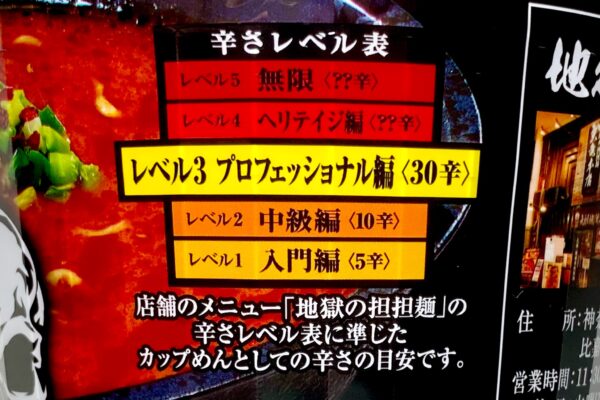 パッケージには “店舗のメニュー「地獄の担担麺」の辛さレベル表に準じたカップめんとしての辛さの目安です„ との注意書きがあるので、お店の辛さを実直に再現しているわけではない様子。ちなみに「レベル3 プロフェッショナル編」の表示は、2023年1月発売の「地獄の担担麺監修 地獄のまぜ麺」と同じレベルなので、けっこうな辛さに期待できそうです。