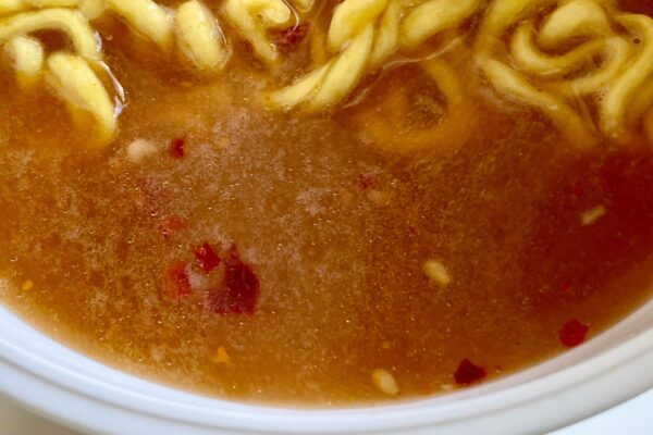 食べ始めにサクッ、パキッとした戻りムラを感じることはなく、もちもちとした弾力が印象的。とはいえ耐久性が高いわけでもなく、とろみの強いスープに温められ、わりと早い段階からフカフカとした質感に変わります。サンヨー食品(太平食品工業)はノンフライ麺に見紛うような油揚げ麺も保有しているため、もう少し頑張ってもらいたかったところ。