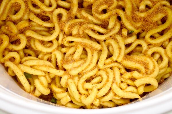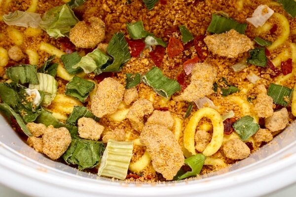 かやくは鶏肉そぼろ、唐辛子、ねぎの組み合わせで、ちょいちょい口の中に入ってくるスパイシーな味付けの鶏肉そぼろが地味にうまい。ネギの加工方法は熱風乾燥なので、それ特有の繊維が強めに残っているのですが、もしも凍結乾燥だったら今回の激辛スープに負けていたかもしれません。