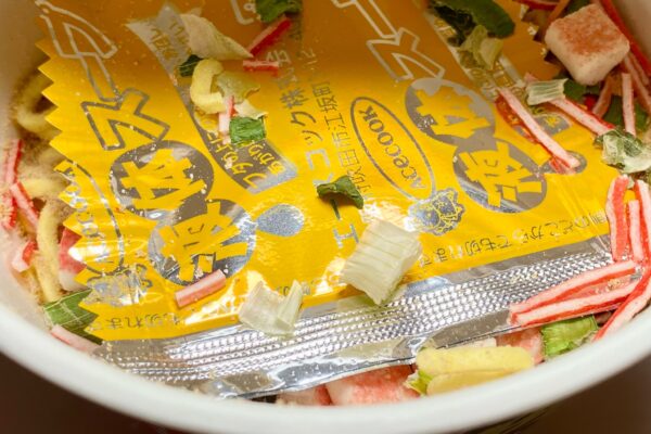 フタのデザインを損なわないためなのか、それとも他に理由があるのかは定かでないけれど、例によって例の如く別添の小袋が容器の中に放り込んであるので、まずはコイツを取り出します。ちなみに「液体スープ」を加えると “ラードのコクが加わる„ とのことなので、ペースト状の蟹醤は使用していないのでしょうか。