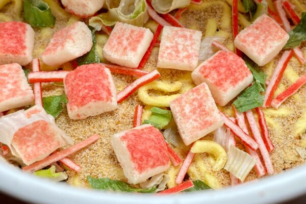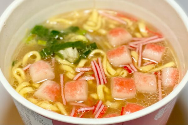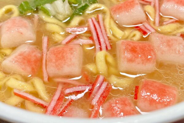 ネギは熱風乾燥の安っぽいアレなので、その風味とジャキジャキした強めの歯触りが好みを選ぶ要素になりますが、そこまで大量に入っているわけではありません。片や2種類の魚肉練り製品は量が多く、大きいカニカマのほうが食べ応えありそうに見えますけど、実は細長い “かに足風かまぼこ„ が真打。