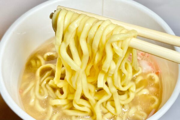 ただ、香りから蟹醤を彷彿とさせるクセは掴めなかったので、引き続き蟹醤の個性と恩恵に注目しつつ「めん」「スープ」「かやく」の特徴を解説し、カップ麺としての総合力を判定します。