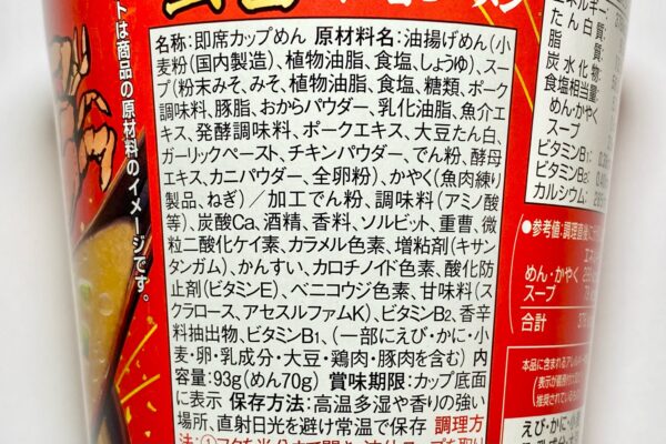 | 【原材料名】油揚げめん(小麦粉(国内製造)、植物油脂、食塩、しょうゆ)、スープ(粉末みそ、みそ、植物油脂、食塩、糖類、ポーク調味料、豚脂、おからパウダー、乳化油脂、魚介エキス、発酵調味料、ポークエキス、大豆たん白、ガーリックペースト、チキンパウダー、でん粉、酵母エキス、カニパウダー、全卵粉)、かやく(魚肉練り製品、ねぎ)/ 加工でん粉、調味料(アミノ酸等)、炭酸Ca、酒精、香料、ソルビット、重曹、微粒二酸化ケイ素、カラメル色素、増粘剤(キサンタンガム)、かんすい、カロチノイド色素、酸化防止剤(ビタミンE)、ベニコウジ色素、甘味料(スクラロース、アセスルファムK)、ビタミンB2、香辛料抽出物、ビタミンB1、(一部にえび・かに・小麦・卵・乳成分・大豆・鶏肉・豚肉を含む) |