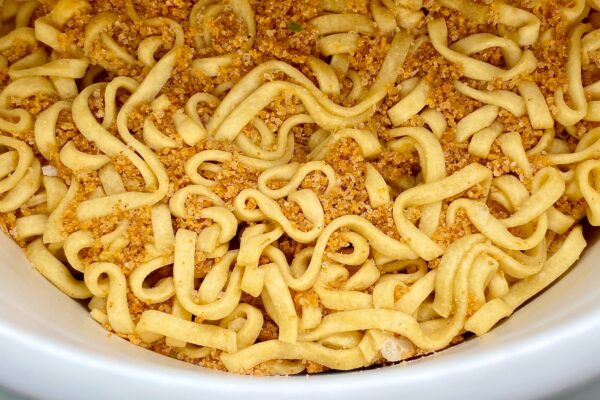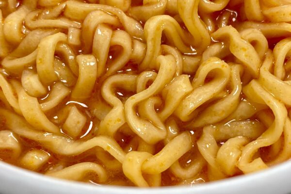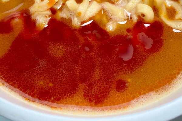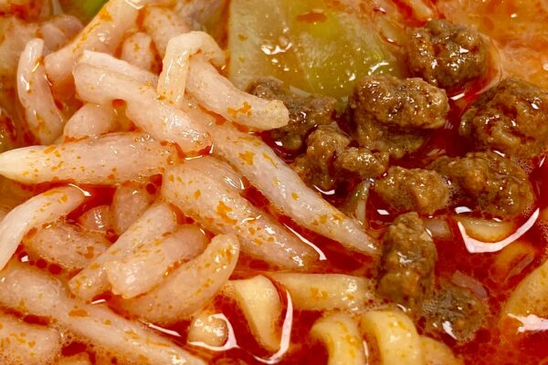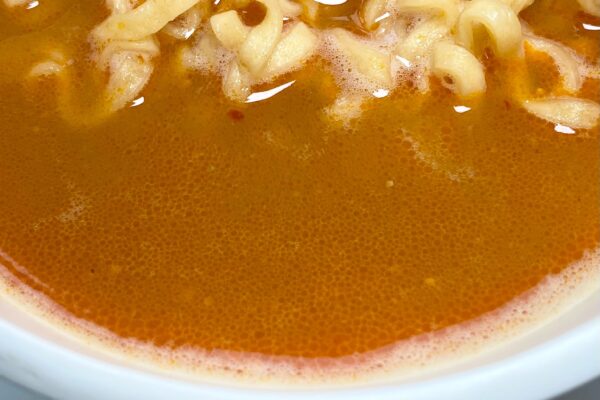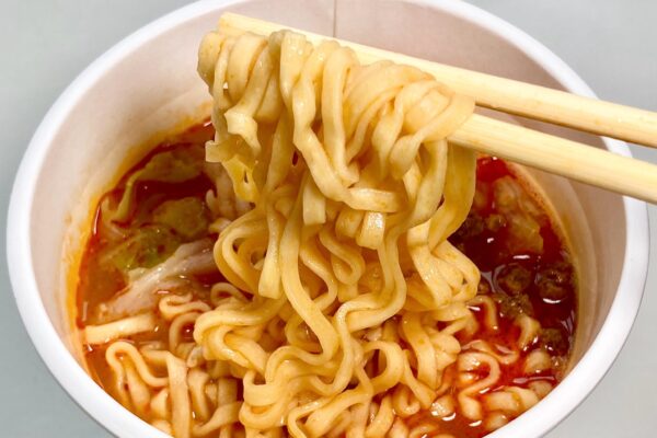 後述する辛いスープとの相性も良好で、むしろムチムチの多加水麺やスパッと切れる低加水麺だったら合わなかっただろうなと。ちなみにコラボ系の縦型ビッグ製品における調理前の麺重量は、平均して70gに落ち着くことが多いのに対し、こちらはシリーズ初の変わり種でも通常の「みそきん」と同じ80gだったので、食べ応えはバッチリ。むしろ吸水率の関係か減るのが遅く、数値以上の食べ応えが得られました。