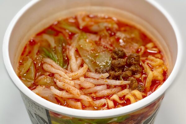 有名店監修の本格的なカップラーメンに使われるようなタイプではなく、乱暴に例えるなら「カップヌードル カレー」の延長線上に位置しているような系統で、サイズのわりに加水率は低めの配合。また熱湯5分きちんと守っても柔らかめに仕上がる仕様だったり、揚げ油に由来する独特のニオイが目立っていたり、潔いまでにカップラーメンらしい質感ではあるものの、ちょっと面白かったのが食感の変化。