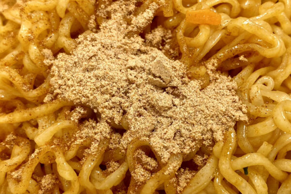片や別添の「スパイス」には刺激の弱い香辛料をメインに配合しているのがポイントで、シナモンに由来する甘さとクミンの香りが強く、それが「麻辣湯」らしい薬膳感の表現に効果的。かつて隆盛を極めた麻辣系の汁なしカップ麺とは違う、ありそうでなかった構成に本格さと新鮮味を感じました。