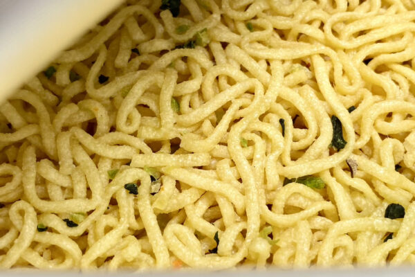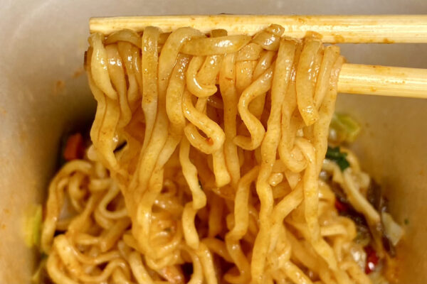 この細さと原材料名の構成から察するに、おそらく定番の「焼そばモッチッチ」と同じ “もちもち真空仕立て麺„ なので、ぶっちゃけ新鮮味はありません。しかし、油で揚げたフライ麺でありながら、その質感はノンフライ麺に肉薄。正直、何も言われなかったらカップ麺研究家の筆者でも一瞬の迷いが生じるほど。