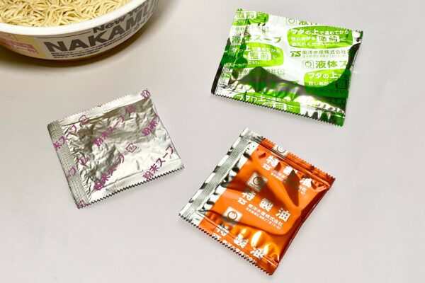 今回のカップ麺に別添されている小袋は、先入れの「粉末スープ」に、後入れ「液体スープ」と「特製油」の組み合わせで、かやくは入っていません。この構成を特徴とする東洋水産のカップラーメンといえば、ファミリーマート限定の「Lab Q かけ醤油らぁ麺」や「麺屋極鶏 鶏だく かけ極濃鶏白湯」「NIBOSHIMANIA かけ濃厚煮干そば」などの実績があるため、期待値の高さは申し分ない展開。