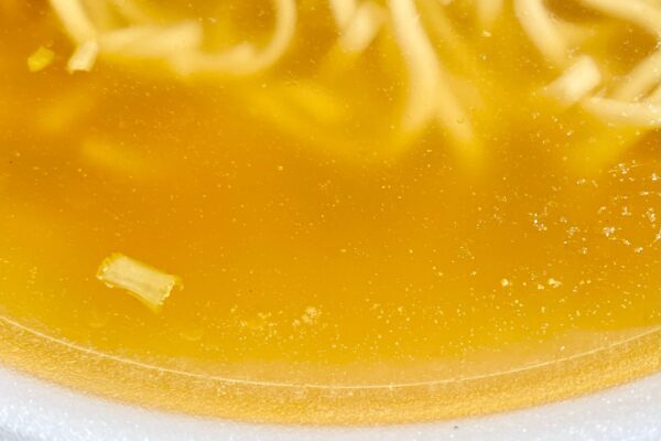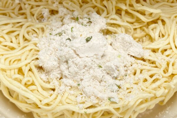 調理中に「粉末スープ」の味を確認してみたところ、出汁(だし)っぽい旨み成分(グルタミン酸系)が強く、かなり人工的な味わい。ガーリックチップの香味も並行してはいるものの、あくまでサポート的な役割です。