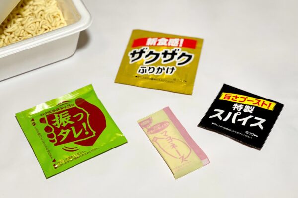 今回のカップ麺に別添されている小袋は、振っタレ!の訴求が印象的な「コクとろダレ」に「マヨネーズ」「新食感!ザクザクふりかけ」「旨さブースト!特製スパイス」の組み合わせで、コクとろダレの外装はNB(ナショナルブランド)の「明星 ぶぶか 油そば」を踏襲していますが、ふりかけ・スパイスは「ななチキ推奨 ぶぶか油そば」専用のデザイン。