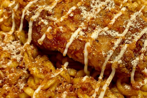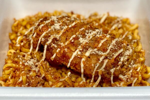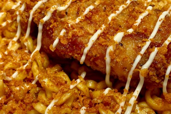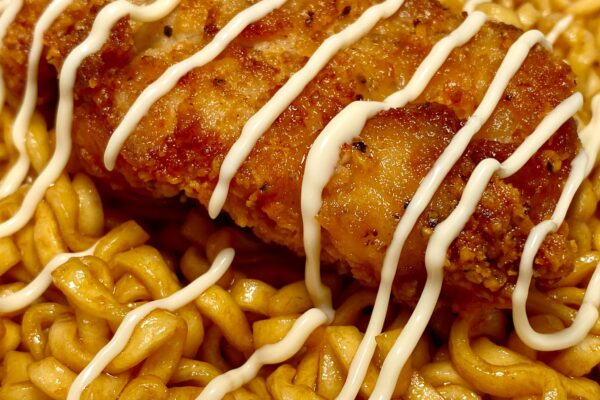 マヨネーズが思いのほか主張してこなかったのは残念なポイントになりますけど、ふりかけのザクザクが衣の揚げたて感ブーストし、某フライドチキンを彷彿とさせるスパイスの香りが加わることで、より専門的な味わいに。油揚げ麺とタレは「ぶぶか」らしさを忠実に守り、ふりかけとスパイスは「ななチキ」サイドに振り切っている、いい意味で両極端な構成でありながら、まったく違和感を与えないランディングも見事。