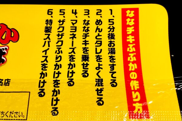 パッケージには “別売りのななチキを乗せて食べよう!„ と書いてありますけど、はたして「ななチキ推奨 ぶぶか油そば」を調理してから「ななチキ」をトッピングするのか、それとも特別な調理手順が必要なのか——などと思いながら裏面を確認してみたところ『ななチキぶぶかの作り方』を発見。