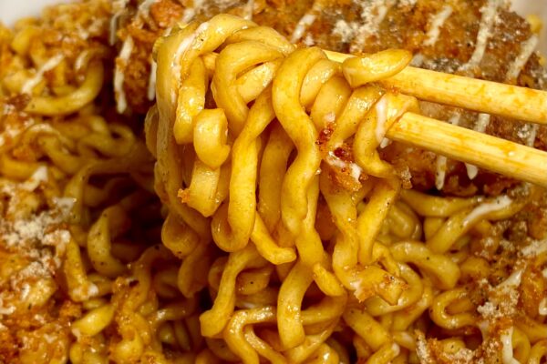 麺は油で揚げた太めのフライ麺で、湯戻し時間も長めの5分。調理前のビジュアルは定番の「明星 ぶぶか 油そば」と酷似した雰囲気で、原材料名の「小麦粉(国内製造)、植物油脂、食塩、しょうゆ、植物性たん白、酵母粉末」という構成も完全に一致することから、通常品と同じ麺を使用している可能性は高いです。