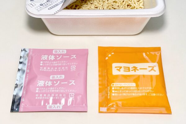 今回のカップ麺に別添されている小袋は、後入れの「液体ソース」と「マヨネーズ」だけなので、ふりかけなどは入っていませんが、マヨネーズのサイズw ちなみに「一平ちゃん夜店の焼そば」に別添されている「からしマヨネーズ」の量はレギュラーサイズだと約7g、大盛りサイズだと約10gなので、ネトフリマヨネーズの30gは「一平ちゃん夜店の焼そば 大盛」の約3倍。