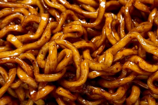原材料名の表示は「辛だるま 旨辛豚骨まぜそば」と完全に一致する内容ですが、調理前の形状や調理後の質感も別物。表面のソフトなアプローチは共通する項目になるけれど、中心部にカタめの芯を感じることはなく、どちらかといえば比較的に粘りを重視。