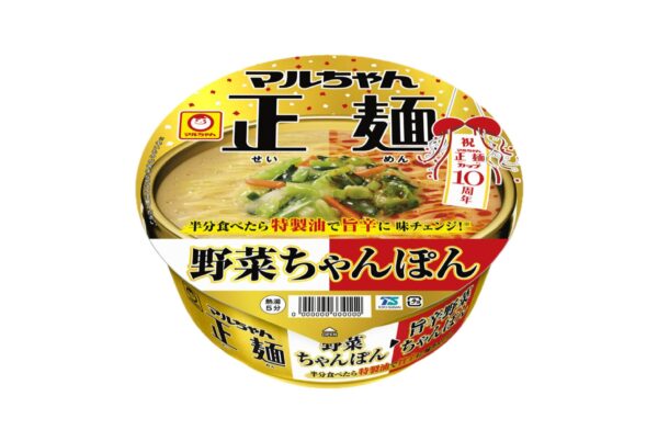 興味深い一杯といえば、半分食べたら “特製油で旨辛に味チェンジ„ をコンセプトに据えた「マルちゃん正麺(せいめん)カップ 野菜ちゃんぽん⇒旨辛野菜ちゃんぽん」も面白い試みで、2025年(令和7年)10月に「マルちゃん正麺 カップ」ブランドが発売10周年を迎えたことを記念した一杯。