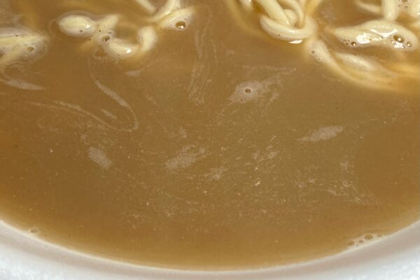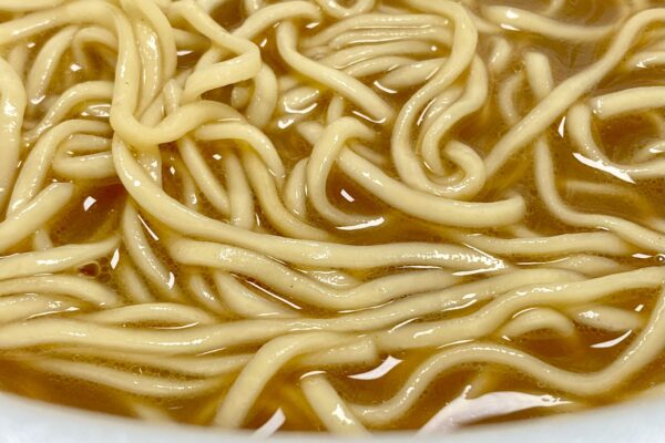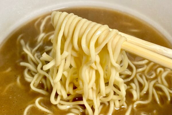 それなりに時間が経つと例の反発性が顔を出し始めますが、それでも従来の「生麺ゆでてうまいまま製法」とは微妙に違う、意外とありそうでなかった食感は予想外。再現度については高く評価できない仕上がりになりますけど、後述するスープとの相性に問題はなく、ひとつのカップラーメンとして違和感なく成立していました。