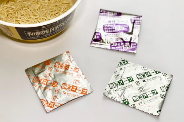 今回のカップ麺に別添されている小袋は、先入れの「粉末スープ」2パックに、後入れ「液体スープ」の組み合わせで、先に触れたように「かやく」は入っていません。ただ、スープだけで合計3袋。なかでも粉末スープに大量の煮干し粉を配合している可能性が高いため、とんでもない煮干し感に期待できそうなラインナップ。