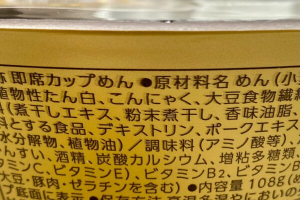 | 【原材料名】めん(小麦粉(国内製造)、でん粉、食塩、植物性たん白、こんにゃく、大豆食物繊維、植物油脂、乳糖)、添付調味料(煮干しエキス、粉末煮干し、香味油脂、しょうゆ、食塩、乳等を主要原料とする食品、デキストリン、ポークエキス、砂糖、酵母エキス、たん白加水分解物、植物油)/ 調味料(アミノ酸等)、加工でん粉、カラメル色素、かんすい、酒精、炭酸カルシウム、増粘多糖類、レシチン、酸化防止剤(ビタミンC、ビタミンE)、ビタミンB2、ビタミンB1、(一部に小麦・乳成分・大豆・豚肉・ゼラチンを含む) |