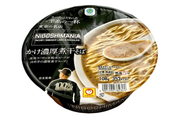 このページでレビューする「NIBOSHIMANIA かけ濃厚煮干そば」は、煮干しエキスがベースの液体スープに、粉末煮干しを使用したW粉末スープと “あえての具材なし„ を特徴とする一杯で、マルちゃんのブランドで知られる東洋水産とファミリーマートが共同開発。