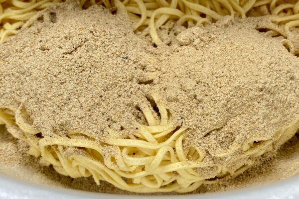 ノンフライ麺を搭載したカップラーメンに小袋が別添されていた場合、熱湯を注ぐ前にスープ類を入れると麺の戻りが悪くなるので、基本的には「召しあがる直前にお入れください」となっているのですが、今回の「粉末スープ」は2袋とも先入れ指定。