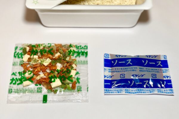 今回のカップ麺に別添されている小袋は、先入れの「かやく」に、後入れ「ソース」の組み合わせで、前述のように公式は “キムチの旨味と辛味をしっかりときかせたソース„ を訴求しているのですが、問題は辛さレベル。パッケージに注意書きこそ見当たらないけれど、他社でいうところの中辛以上をピリ辛と表現してくる企業なので、油断できません。