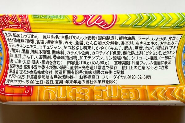 | 【原材料名】油揚げめん(小麦粉(国内製造)、植物油脂、ラード、しょうゆ、食塩)、添付調味料(糖類、食塩、植物油脂、みそ、魚醤、たん白加水分解物、香辛料、あさりエキス、おきあみエキス、チキンエキス、コチュジャン、かつおぶし粉末)、かやく(キムチ、豚肉、豆腐、ねぎ)/ 調味料(アミノ酸等)、酒精、増粘多糖類、酸味料、カラメル色素、カロチノイド色素、酸化防止剤(ビタミンE、ビタミンC)、香料、かんすい、凝固剤、香辛料抽出物、加工デンプン、リン酸塩(Na)、シリコーン樹脂、(一部に小麦・ごま・大豆・鶏肉・豚肉を含む) |