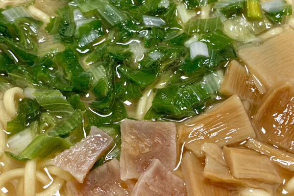 焼豚は既存の「来来亭 背脂しょうゆラーメン」にも入っているチップ状の豚肉で、そこそこ厚みのある形状。まさかの3枚半しか入っていなかったのですが、エースコックを代表する(?)あの粗悪なスポンジ肉そぼろとは比較にならないほどマトモな具材。片やメンマの量は多く、特有の発酵感が豚骨醤油味のスープと背脂の香ばしさにフィット。こりこりした歯応えも心地よく、食感のアクセントに効果的。