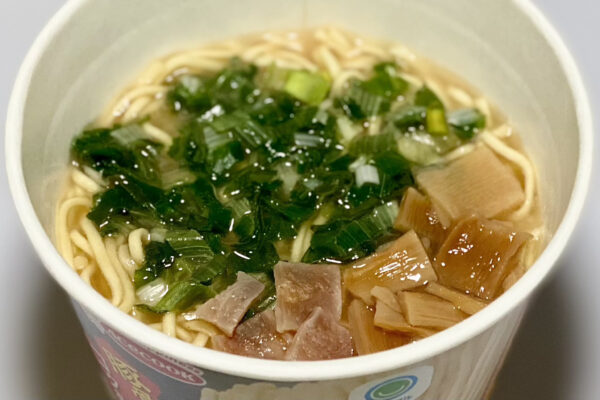 片やネギの量は「葱盛り」にしては常識的に思えますけど、さすが熱風乾燥。この時点で香りは強めに主張してくるため、せっかくの背脂がマスキングされていないかどうかにも注目しつつ「めん」「スープ」「かやく」の特徴を解説し、カップ麺としての総合力を判定します。
