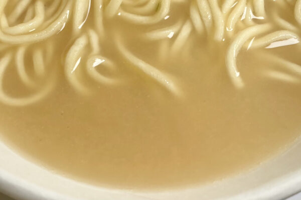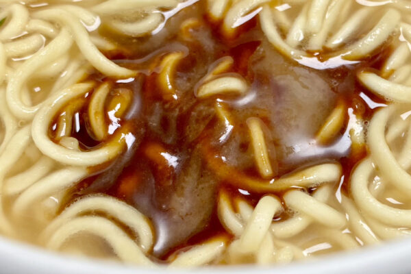 続けて粉末スープまみれの小袋(銀色)に充填されていた「液体スープ」を加えると、しょうゆのキレや炊き出し感のある豚骨の旨みが加わって、いっきに臨場感のある味わいに。まさに「来来亭」といえばの鶏ガラしょうゆ味とは違う “豚骨醤油味„ に仕上がりますが、その比率は明らかに豚骨が優勢。まろやかさをコラーゲンで強調している、というのもエースコックらしい手法になるけれど、わざとらしさはありません。