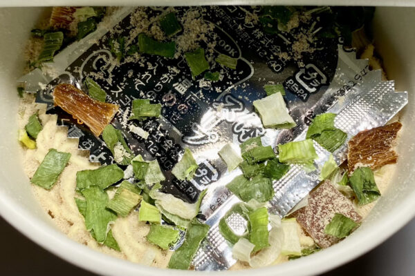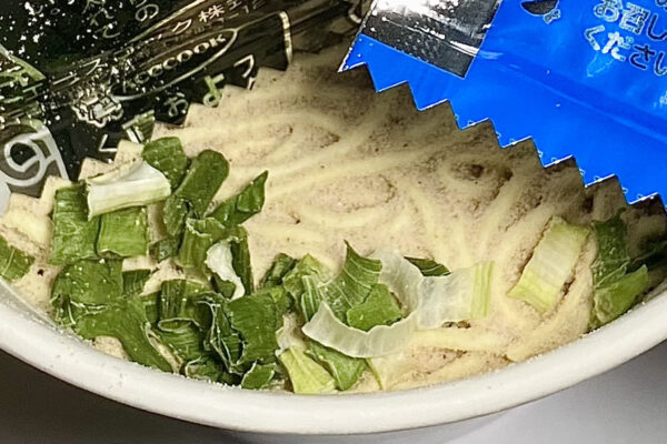 麺は油で揚げたフライ麺で、湯戻し時間は標準の3分。この時点でエースコックといえばの揚げ油に由来するニオイが漂ってくるため、苦手な方は尻込みしてしまうかもしれません。ちなみに約6年半前の「来来亭 こってりラーメン」とは形状が異なりますが、さすがにリニューアルしてますよね。あと、このネギは間違いなく熱風乾燥です。