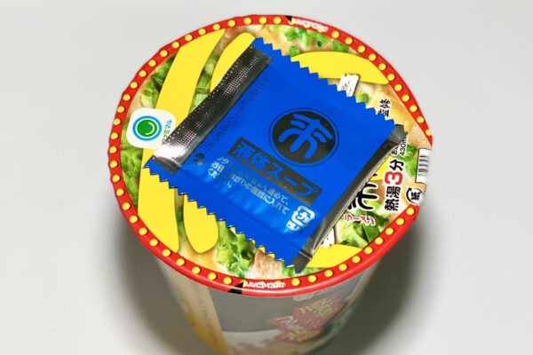 今回のカップ麺にはフタの上に「液体スープ」が別添されているので、給湯時の火傷リスクを下げるためにも最初に引っ剥がさないといけないのですが、製造者はエースコック。同社のタテロング製品でフタ上に小袋が貼り付けられている場合、ほぼ例外なく‥‥