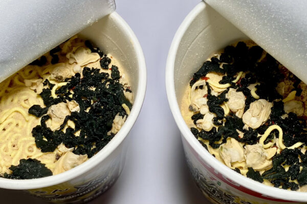 スペック上はオリジナルのバランスを維持しているように見えますが、見定めると麺の吸着力は計算に入っていないため、それがスープの勢い不足を招いてしまったのかもしれません。これは同時に食べ比べた結果の体感差であって、ふつうに単体で食べる分には気にならないような気もしますけど、わかめ・あさりの風味や塩味についてもレギュラーサイズのほうが圧倒的にくっきりとしていました。