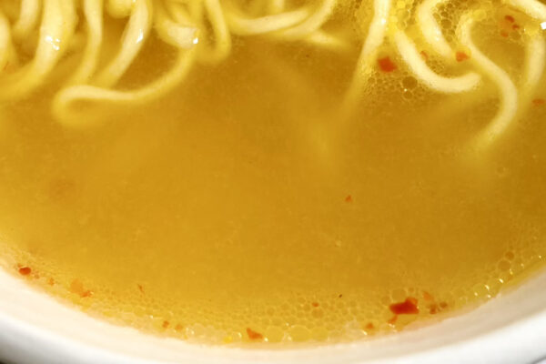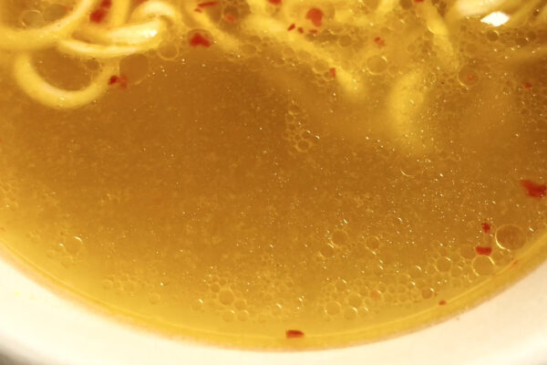 これといって弾力が強化されているわけではないため、レギュラーサイズと同じペースで食べ進めた場合、食べ終わりの食感は比較的に柔らかくなっているけれど、ネガティブにダレるような奴ではありません。もちろん物量的な食べ応えはレギュラーサイズを上回りますが、麺の量が増えたからこそ、ある大きな変化がスープの感じ方に生じていました。