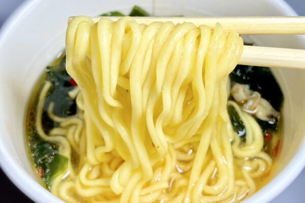 レギュラーサイズの「わかめたくさんあさりだし塩ラーメン」に搭載されている油揚げ麺は、この細さに反して密度感が高く、かつて一世を風靡した「和ラー」の流れを汲む質感。2025年3月に定番化して以降、従来品よりも耐久性が落ちてしまったように感じているのですが、サンヨー食品の縦型カップに使われる油揚げ麺の中では上位に食い込むクオリティの高さを維持しています。
