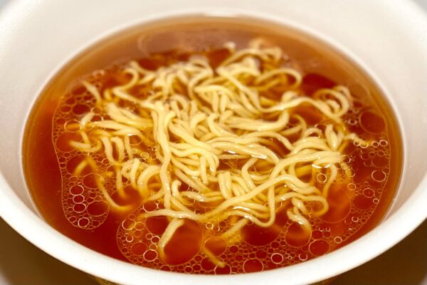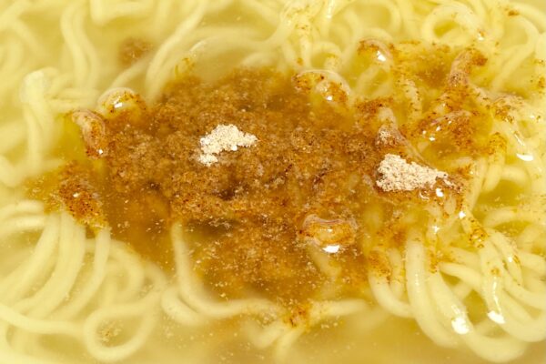 つまり、今回の新作は「佐野実の伝説の一杯」から具材を省いたカップラーメンなのでは——などと思いつつ、さておき本商品は “まずは麺とスープだけを味わう„ ことを推奨しているため、時間になったら「粉末スープ」と「液体スープ」だけ投入し、全体に馴染ませたら完成です。現時点では完全に「麺とスープだけ」なので、これ以上ないほどシンプルな仕上がり。