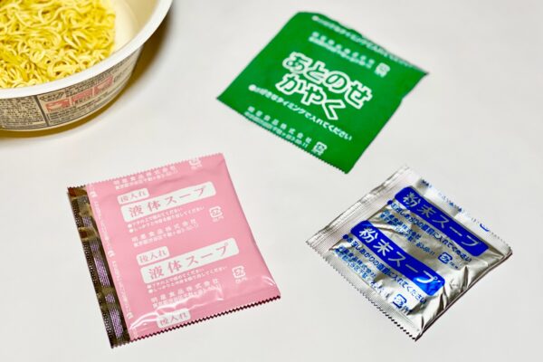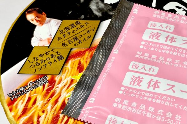 今回のカップ麺に別添されている小袋は、後入れの「粉末スープ」と「液体スープ」に “お好きなタイミングで入れてください„ と書かれた「あとのせかやく」の組み合わせで、明星食品が打ち立てた「だしパック入り」の金字塔は継承されていませんが、北海道産ホタテのエキスと名古屋コーチンのオイル使用は大きなステータス。
