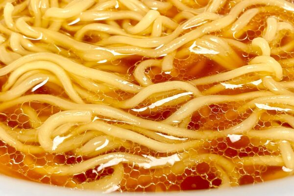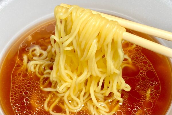 麺は油で揚げずに乾燥させたノンフライ麺で、けっこう細めに切り出されていますが、湯戻し時間は長めの5分。先ほど引き合いに出した東洋水産の「かけ系」には、PB・NBもれなく「生麺ゆでてうまいまま製法(特許5719064号)」のノンフライ麺が搭載されているためバリエーションに欠ける印象があるけれど、明星食品の場合そういった不安はありません。
