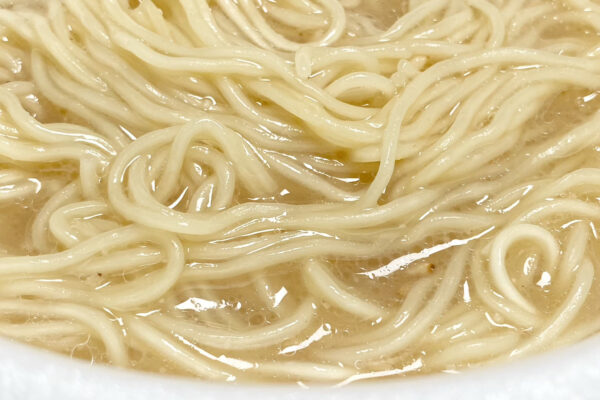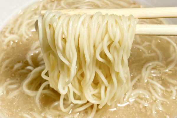 麺は油で揚げずに乾燥させたノンフライ麺で、かなり細めに切り出されていますが、湯戻し時間は標準の3分。サイズや形状、さらに原材料名も初代「濃厚豚骨ラーメン」から変わっていないため、ずっと同じノンフライ麺を使用しているのかもしれません。ってことは、あの感動も——。