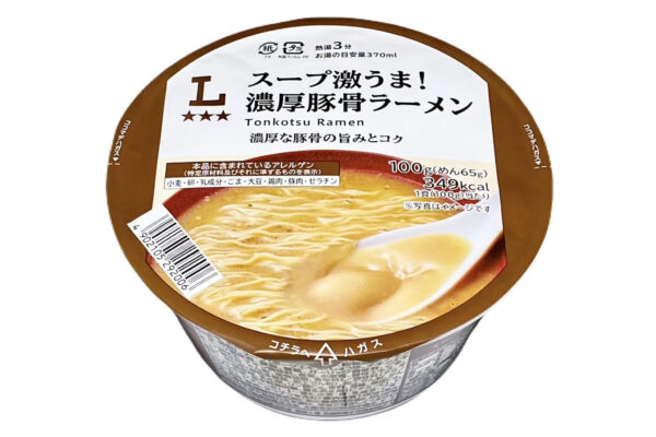 このページでレビューする「スープ激うま!濃厚豚骨ラーメン」は、シリーズ第1弾を飾った「濃厚豚骨ラーメン」の流れを汲む一杯で、これまでに何度か再販されているのですが、そういえばローソンのプライベートブランドが “3つ星ローソン„ に変わって以降、一度もブログで触れていなかったなと。
