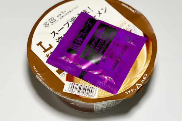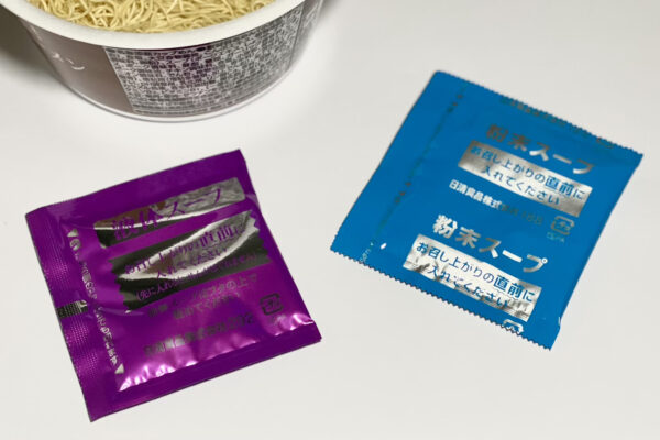 今回のカップ麺に別添されている小袋は、初代「濃厚豚骨ラーメン」と同じ後入れ「粉末スープ」と「液体スープ」の組み合わせで、小袋のデザインや色も変わっていません。ただ、標準どんぶり型の容器に対し、あらためて添付調味料の量が多いなと。それこそ、有名店が監修した大判どんぶり型の別添と遜色ありません。