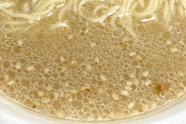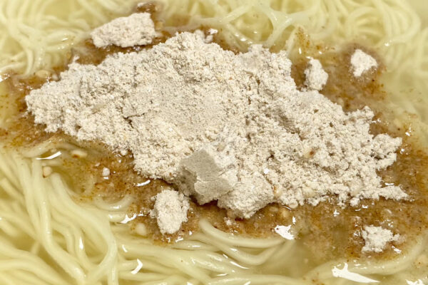——そう、あの “かんすいや酒精に由来するツンとした匂い„ の起因は添付調味料だった。粉末スープには豚骨由来の骨っぽさと、若干の生臭さを演出する系統のポークエキスを使用しており、糖類の甘さでジャンクな面持ちもあるけれど、舌に纏わり付いてくるような人工甘味料に由来する野暮ったい甘さは気になりません。あと、ごまの芳ばしいアクセントも健在。