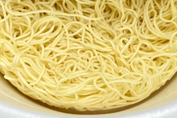 それをあらためて確認したかったので、別添の「粉末スープ」や「液体スープ」を入れる前に、湯戻し後のノンフライ麺をそのまま食べてみたんです。いやもうビックリ‥‥かんすいや酒精に由来するツンとした匂いは皆無に等しく、ただただ小麦の香りと甘さが伝わってくる仕上がりに、なんの感動も得られませんでした。