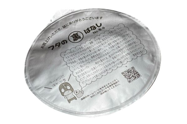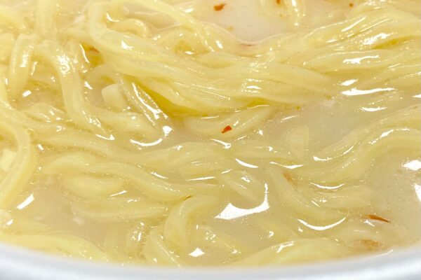 麺は同社の特許技術「凄麺ノンフライ製法」により “ゆでたての旨さ„ を再現した、油で揚げない熱風乾燥のノンフライ麺で、シリーズ20作目も例に漏れず熱湯5分の太麺仕様。その表面や容器の内側にオブラート状の物質が付着していると思いますが、湯戻し後のほぐれにくさを解消するために施された大豆由来の食物繊維なので、健康上の懸念はありません。