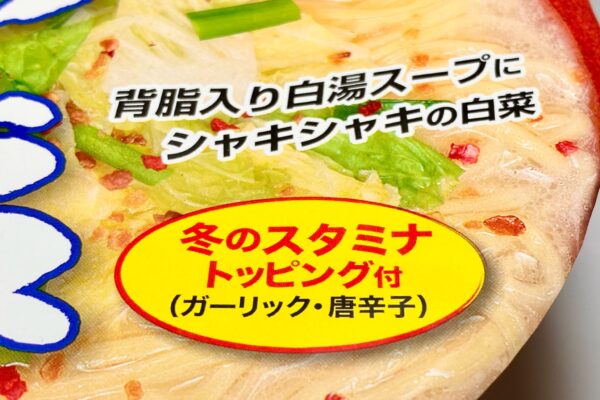 冬のスタミナトッピング(ガーリック・唐辛子)は、2024年11月4日発売品(19代目)に別添されていた「冬のHOTトッピング」と被るため、やや新鮮味に欠ける印象が否めないポイントになりますが、開発担当者曰く “背脂の量を昨年より2倍に増やし、さらに濃厚で背脂のおいしさがつまったスープを目指しました„ とのことなので、前述した「背脂たっぷり濃厚仕上げ」の訴求は伊達じゃありません。さて、それが体感できるのか——。